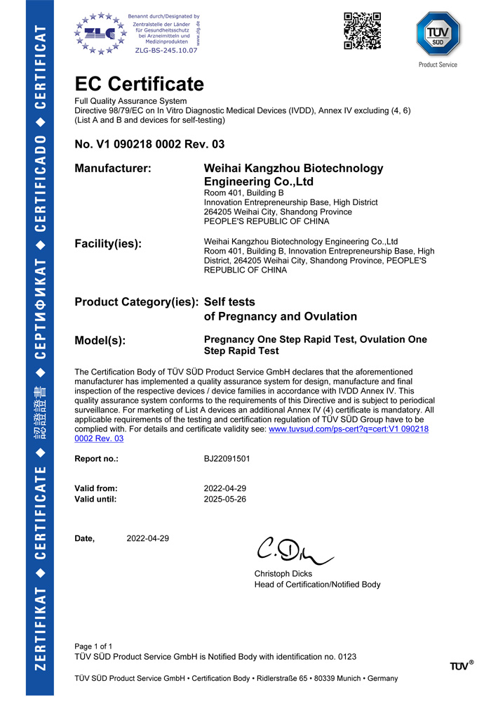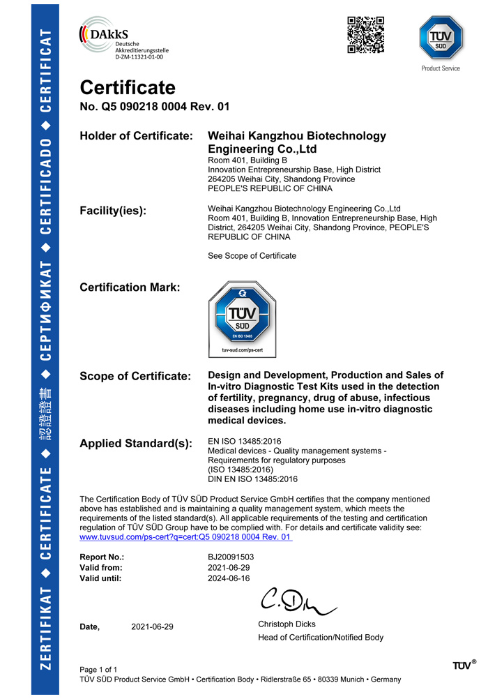 ? ? ?威海康州生物工程有限公司成立于2013年,公司坐落于風景秀麗的海濱小城——威海市。康州生物是集研發(fā)、生產(chǎn)和銷售于一體的生物科技公司,與威海哈爾濱工業(yè)大學(xué)合作研發(fā)團隊,擁有先進的科研基地及生產(chǎn)基地。主要從事快速診斷檢測產(chǎn)品的研發(fā)、生產(chǎn)、銷售。產(chǎn)品涵蓋:生育檢測、藥物濫用檢測、農(nóng)藥殘留檢測以及其他臨床診斷檢測等。公司自主研發(fā)生產(chǎn)得早早孕試紙,排卵檢測試紙,毒品檢測及疾病檢測等醫(yī)用產(chǎn)品,經(jīng)過歐盟認證,產(chǎn)品質(zhì)量穩(wěn)定,值得信賴。